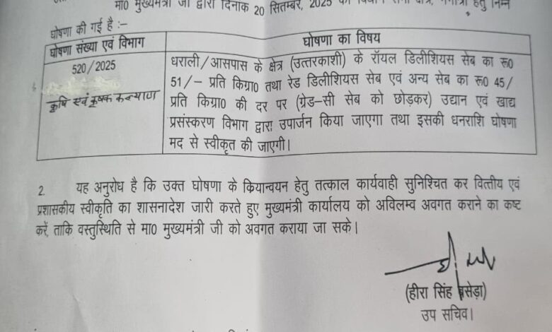 मुख्यमंत्री पुष्कर सिंह धामी ने उत्तरकाशी जिले के आपदा प्रभावित धराली गांव सहित इसके आस-पास के क्षेत्रों के सेब की सरकार द्वारा खरीद किए जाने की घोषणा की है। मुख्यमंत्री द्वारा की गई घोषणा के अनुसार धराली व इसके आसपास के क्षेत्र का रॉयल डिलीशियस सेब रू. 51/- प्रति किग्रा. तथा रेड डिलीशियस सेब एवं अन्य सेब रू. 45/- प्रति किग्रा. की दर पर (ग्रेड-सी सेब को छोड़कर) उद्यान विभाग के माध्यम से खरीदा जाएगा। इसके लिए आवश्यक धनराशि की व्यवस्था मुख्यमंत्री घोषणा मद से की जाएगी।