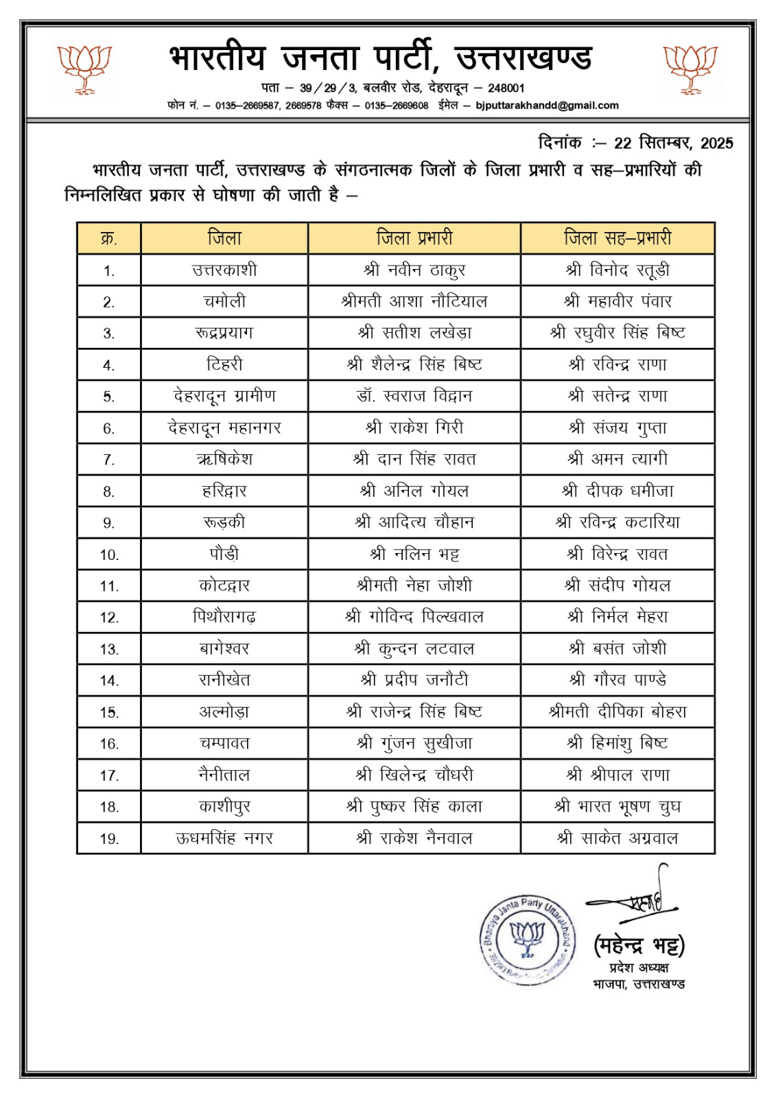 देहरादून। भारतीय जनता पार्टी, उत्तराखंड ने अपने संगठनात्मक जिलों के जिला प्रभारी और सह प्रभारियों की घोषणा कर दी है। भाजपा के प्रदेश अध्यक्ष महेंद्र भट्ट की ओर से इसकी सूची जारी की गई है।