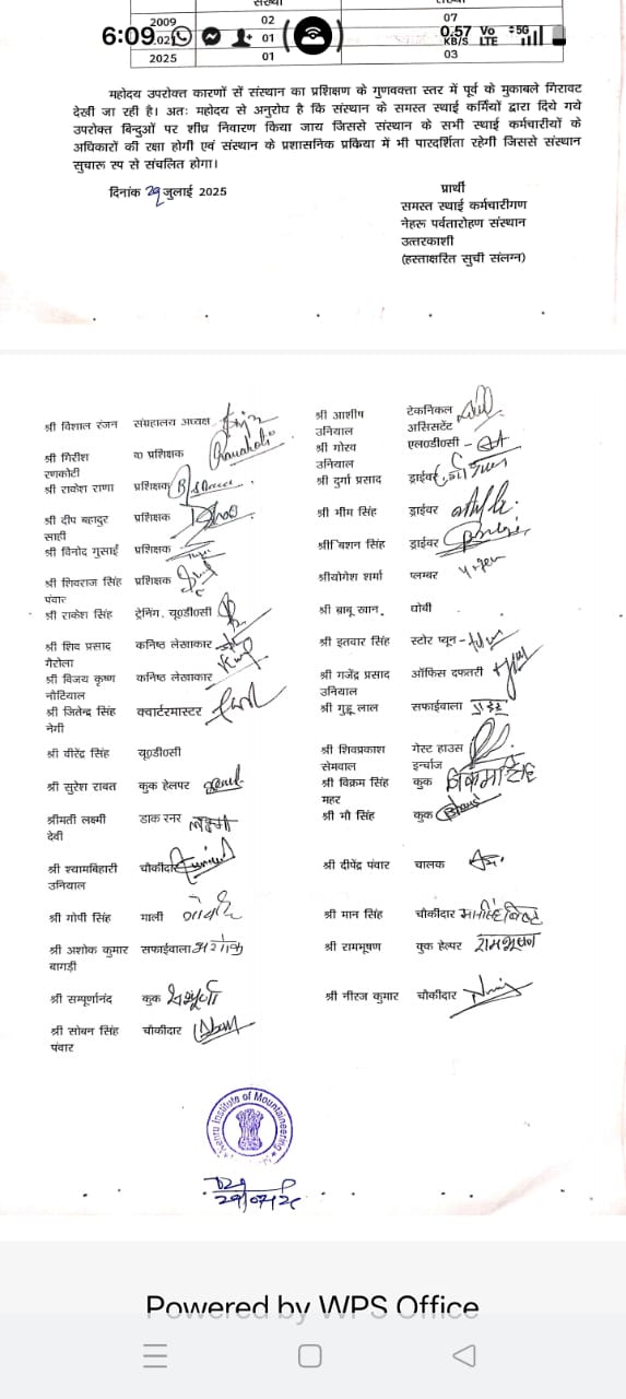 देश के प्रतिष्ठित प्रशिक्षण संस्थानों में शामिल नेहरू पर्वतारोहण संस्थान (NIM) आज गंभीर प्रशासनिक संकट से गुजर रहा है। 29 जुलाई 2025 को संस्थान के कर्मचारियों द्वारा प्रधानाचार्य को सौंपे गए 26 सूत्रीय विस्तृत ज्ञापन ने संस्थान में व्याप्त भ्रष्टाचार, अनियमितताओं और मनमाने प्रशासन की चिंताजनक तस्वीर सामने रखी है। हैरानी की बात यह है कि इतने गंभीर आरोपों के बावजूद अब तक संस्थान प्रमुख द्वारा कोई ठोस कार्रवाई नहीं की गई, जिससे कर्मचारियों में भारी असंतोष व्याप्त है।